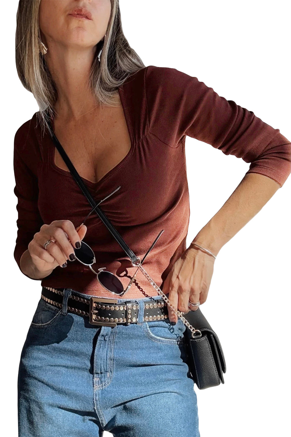 Burgundy Ruched Sweetheart Neck Ribbed Long Sleeve Top