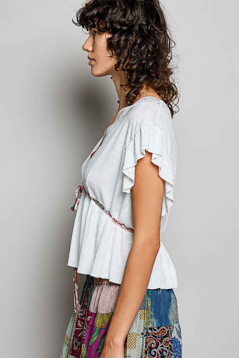 POL Tied Ruffled V-Neck Short Sleeve Blouse with Lace Detail