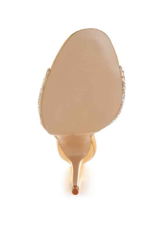 Steal the spotlight with these dazzling embellished heels featuring a roomy rounded toe. The slip on silhouette makes them easy to wear while the stiletto heel adds to the elevation. Team these with your party ensembles and shine bright like a star.