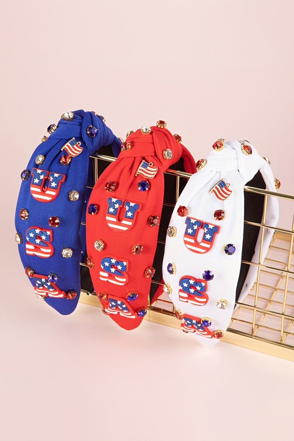 White USA Flag Gemstone Decor Knotted Wide Headband