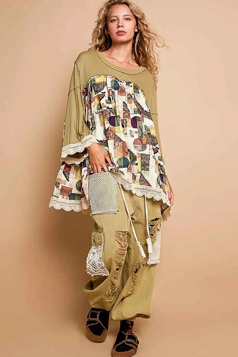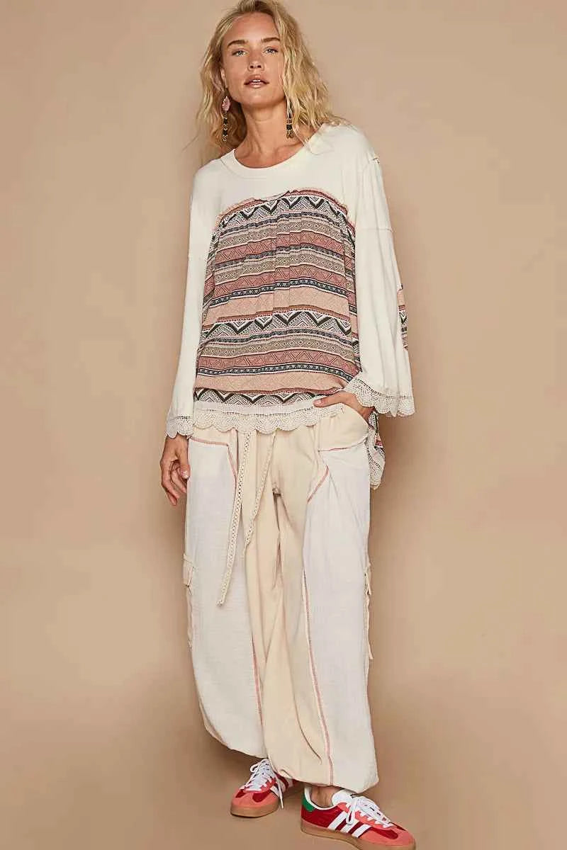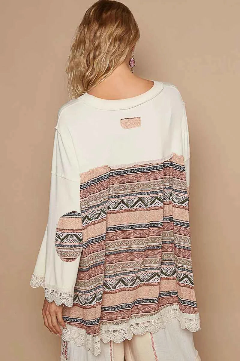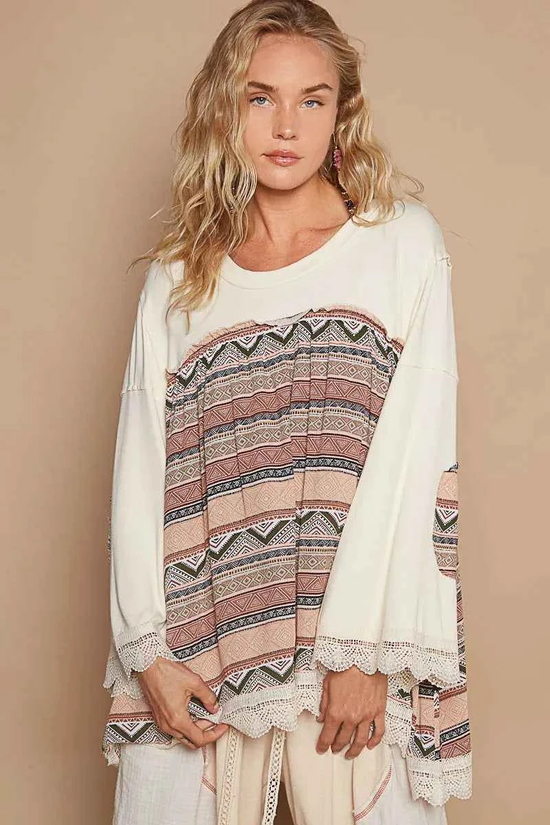 POL Bohemian Geometric Print Long Sleeve Top with Lace Trim -