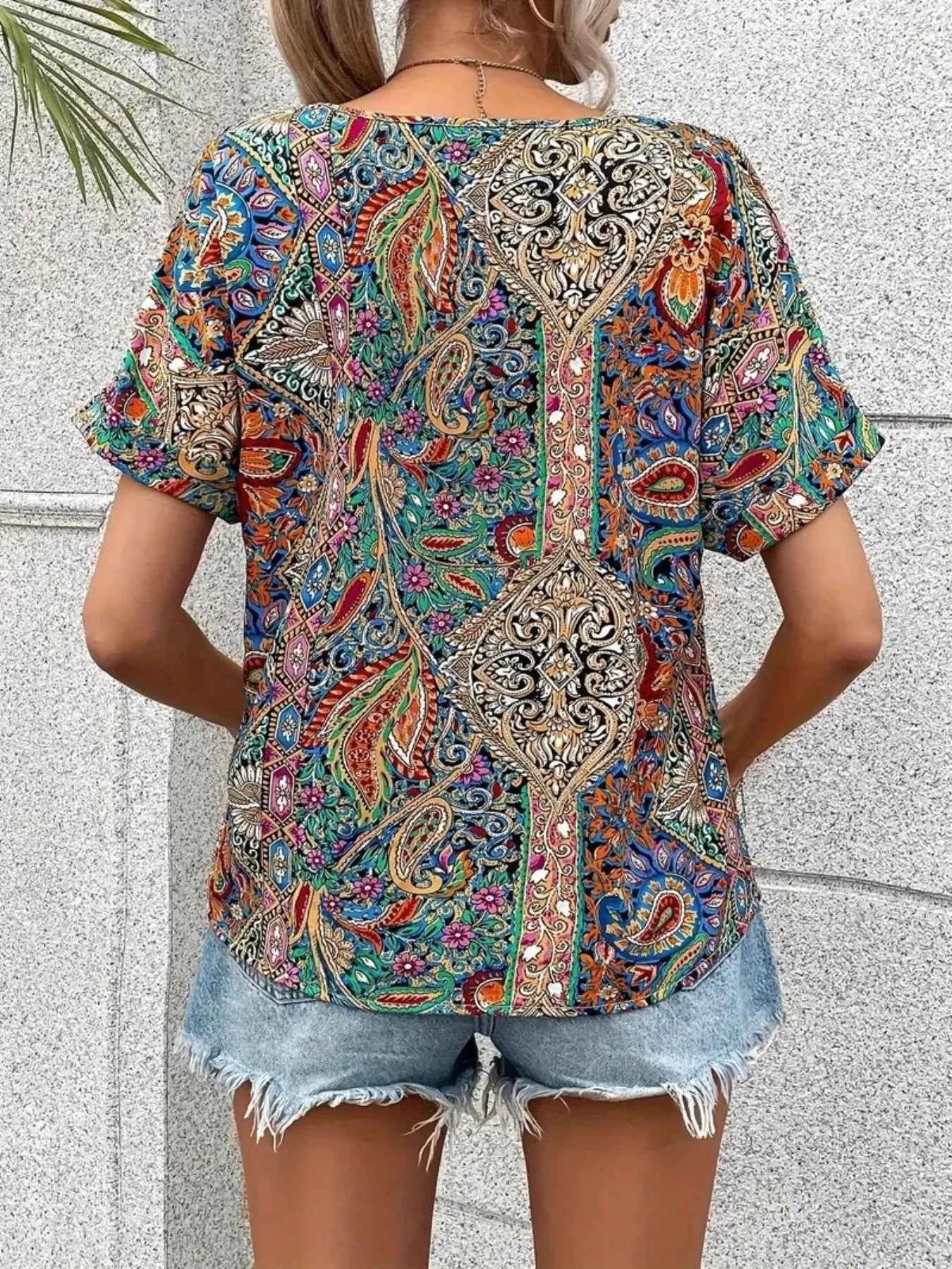 Bohemian Paisley Print V-Neck Short Sleeve T-Shirt -