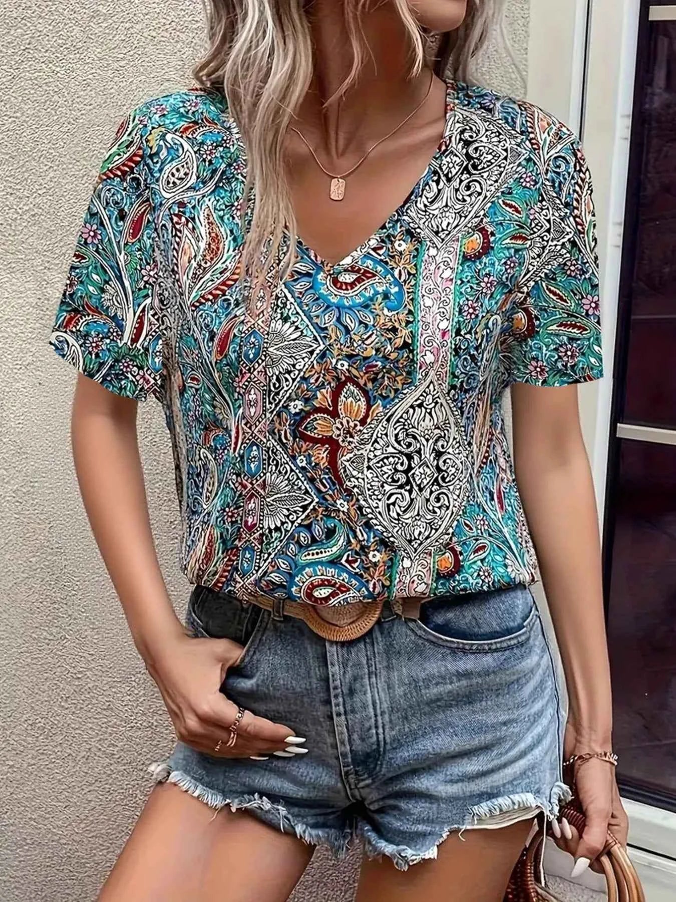 Bohemian Paisley Print V-Neck Short Sleeve T-Shirt Bohemian Paisley Print V-Neck Short Sleeve T-Shirt